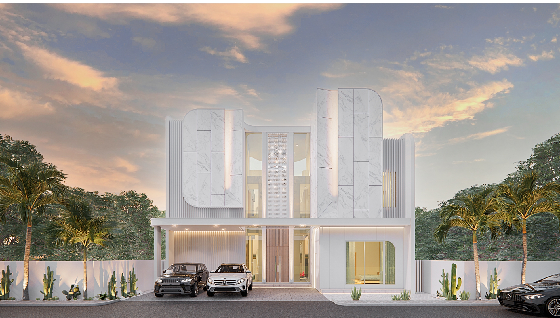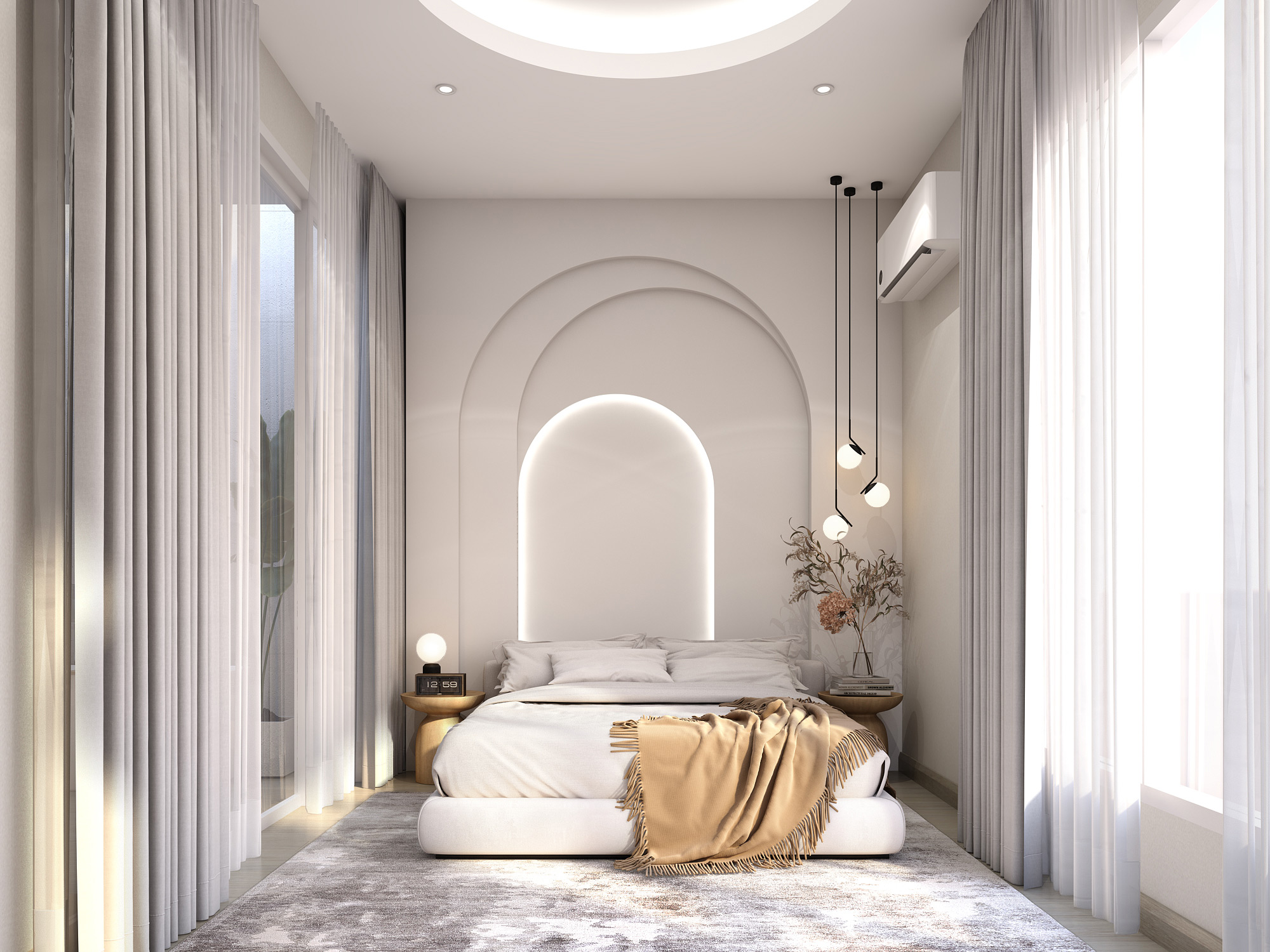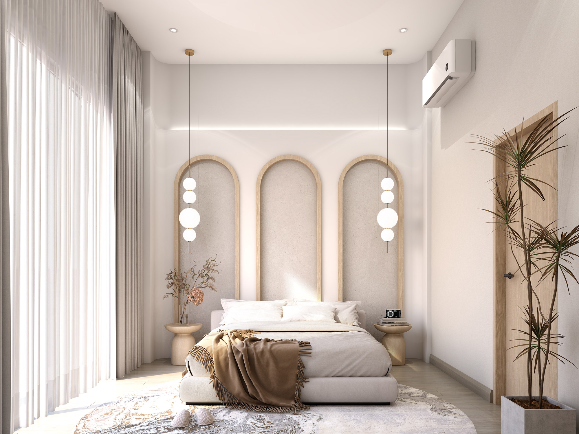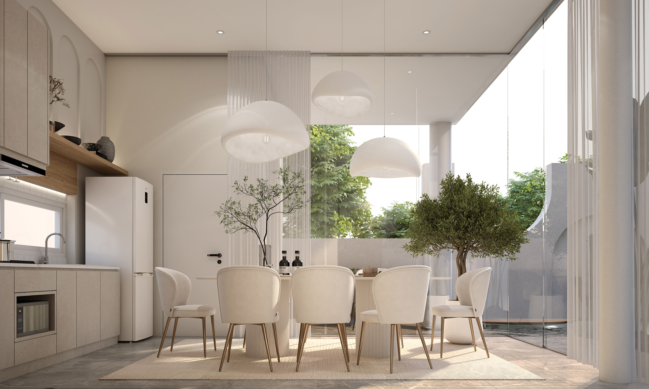 Our villas feature a sleek, modern, and minimalist design with clean white lines, creating a fresh and contemporary aesthetic. The architecture emphasizes the harmonious blend of straight and curved lines, while expansive floor-to-ceiling windows fill the interiors with natural light, offering an open and airy ambiance. Seamlessly connecting indoor and outdoor spaces, the design enhances relaxation, making it the perfect retreat for those seeking comfort and tranquility.