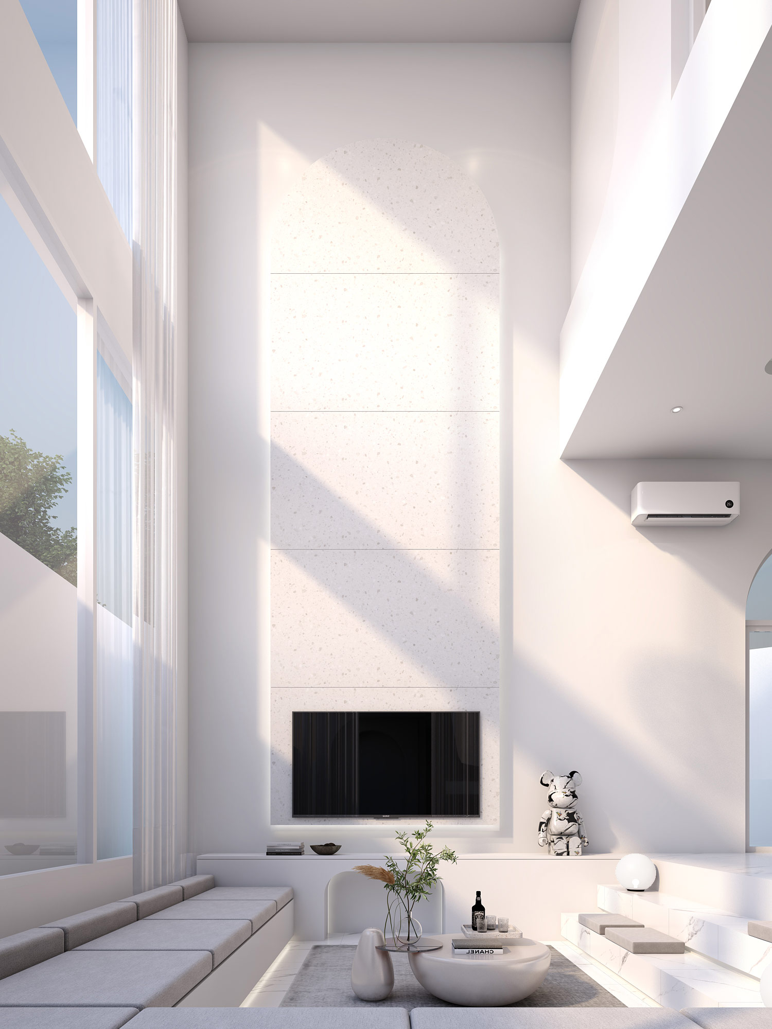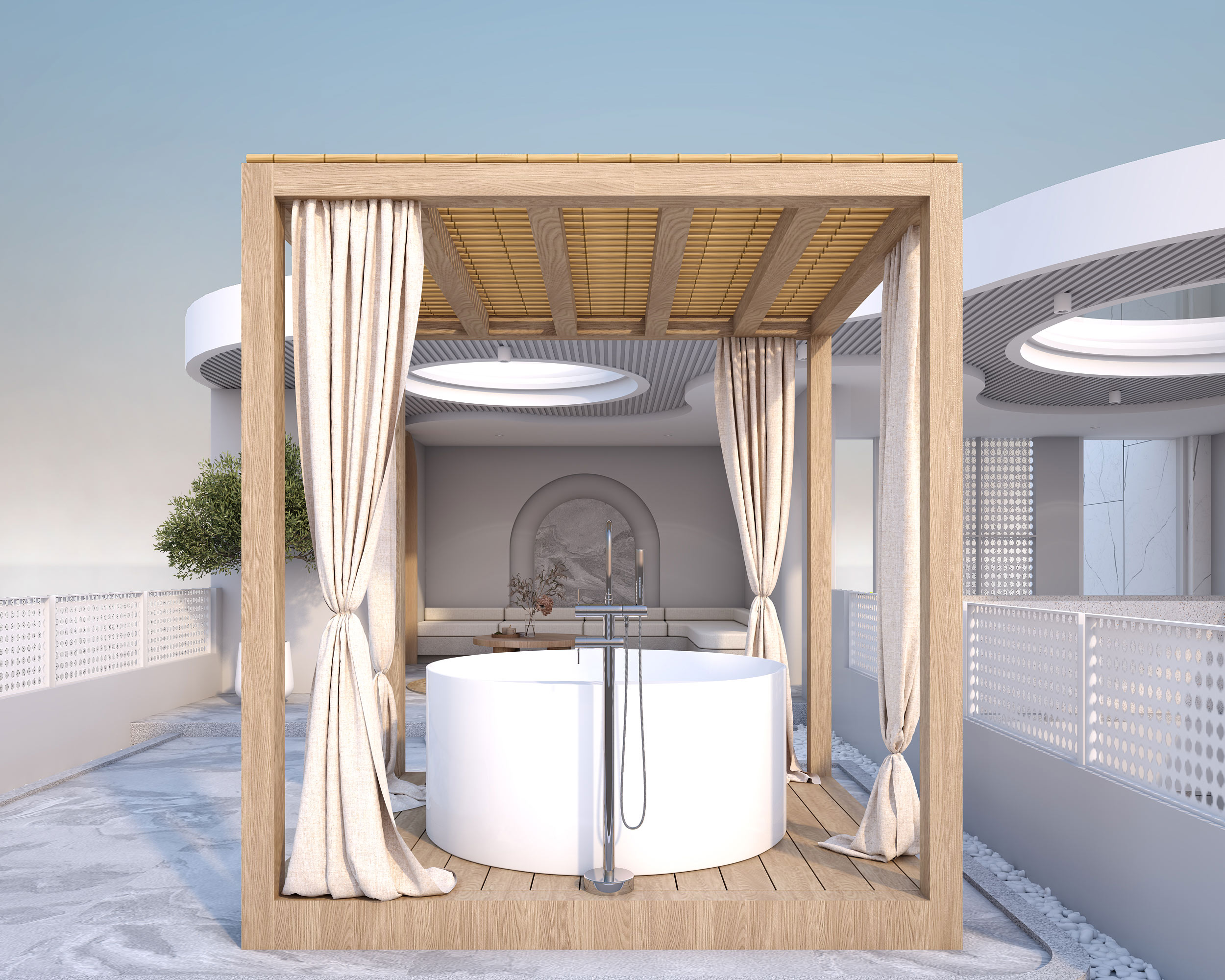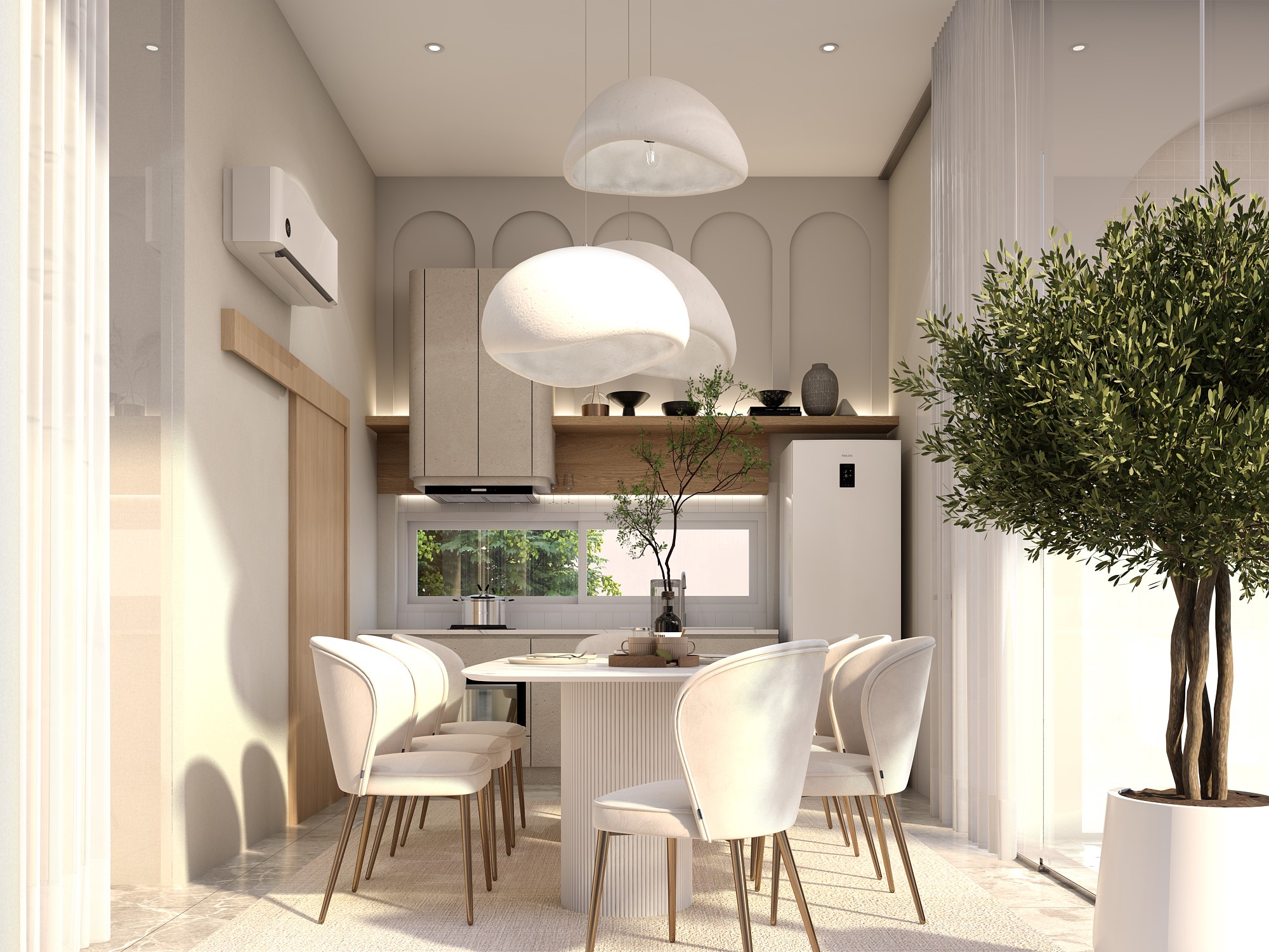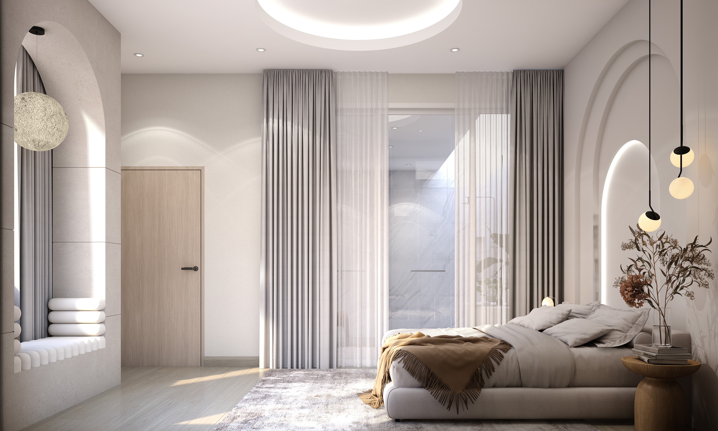 Our villas feature a sleek, modern, and minimalist design with clean white lines, creating a fresh and contemporary aesthetic. The architecture emphasizes the harmonious blend of straight and curved lines, while expansive floor-to-ceiling windows fill the interiors with natural light, offering an open and airy ambiance. Seamlessly connecting indoor and outdoor spaces, the design enhances relaxation, making it the perfect retreat for those seeking comfort and tranquility.