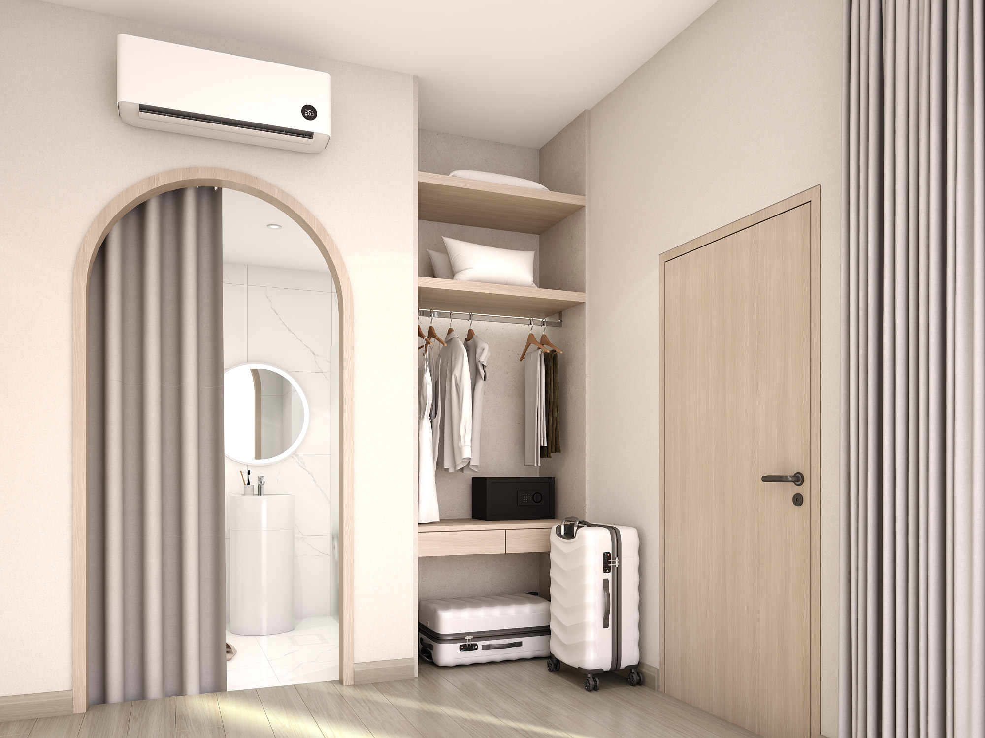 The bedroom features a minimalist Muji-inspired design with soft pastel tones, creating a serene and calming atmosphere. Simple built-in furniture complements the clean aesthetic, while the sliding glass wall allows natural light to fill the space, enhancing the feeling of openness and tranquility.